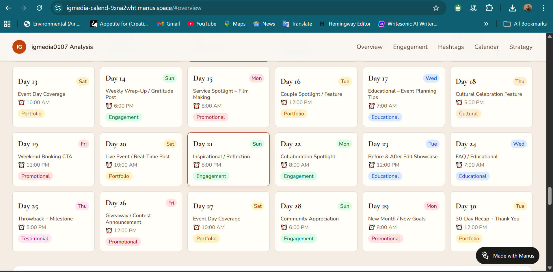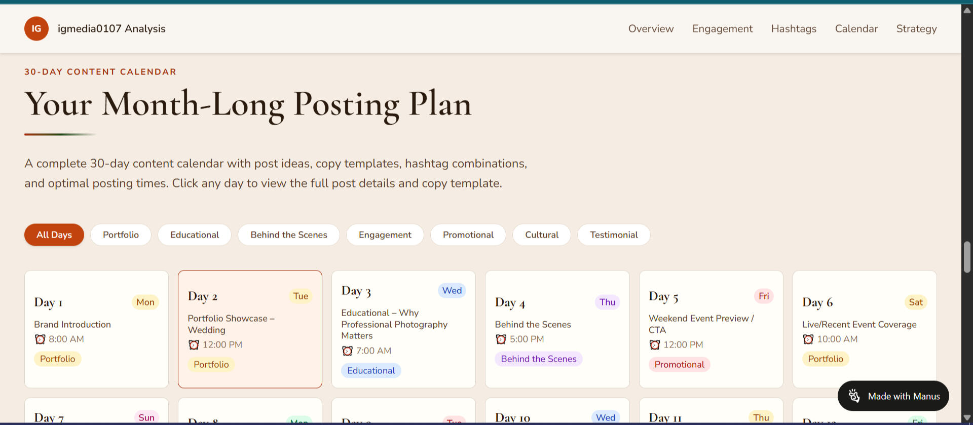 Based on this analysis, I generated a 30-day content strategy tailored to their target audience.