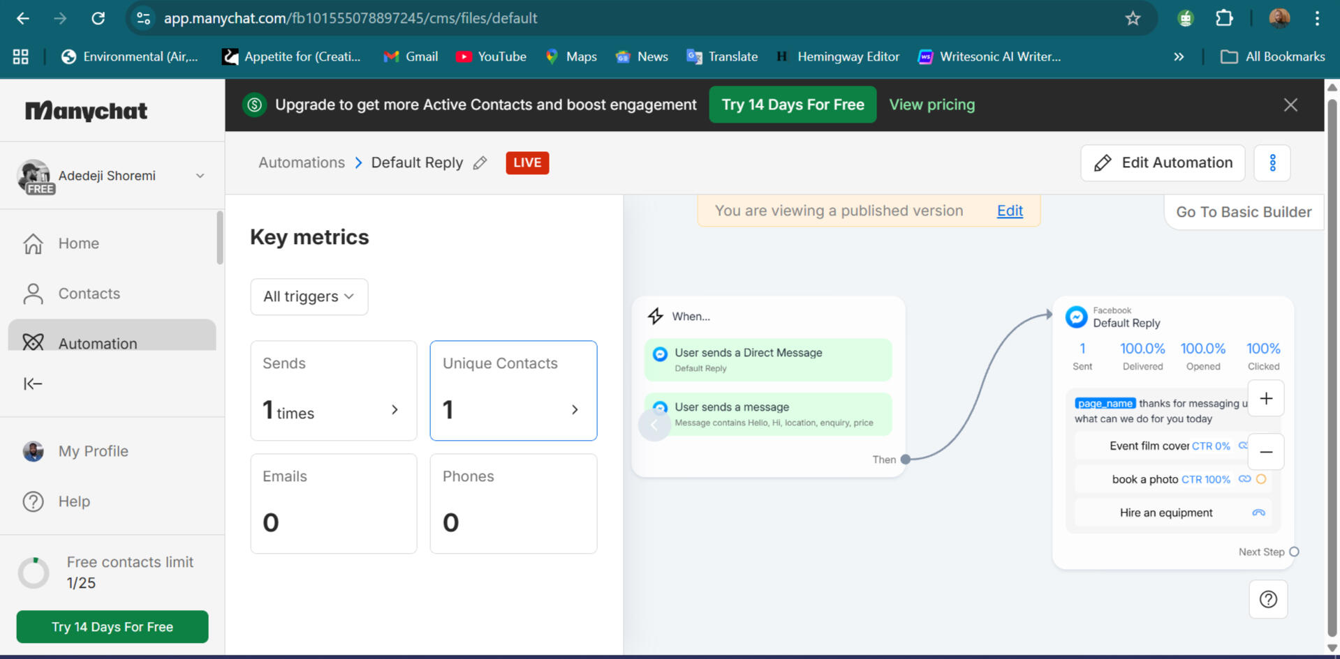 I implemented automated response workflows using ManyChat for:
